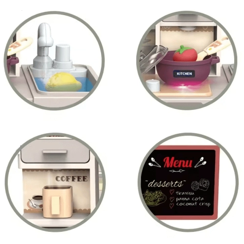 Този забавен кухненски комплект се отличава с яскрави цветове и впечатляващи детайли, за да направи игровото изживяване още по-вълнуващо. С реалистичните светлини, всякакви “благини” стават още по-магически! Вашето мъниче ще се почувства истински шеф-готвач, а играта с него ще е истинско удоволствие. Кухненския сет за деца с 42 см височина и много аксесоари е чудесен начин за учене и развлечение в едно.